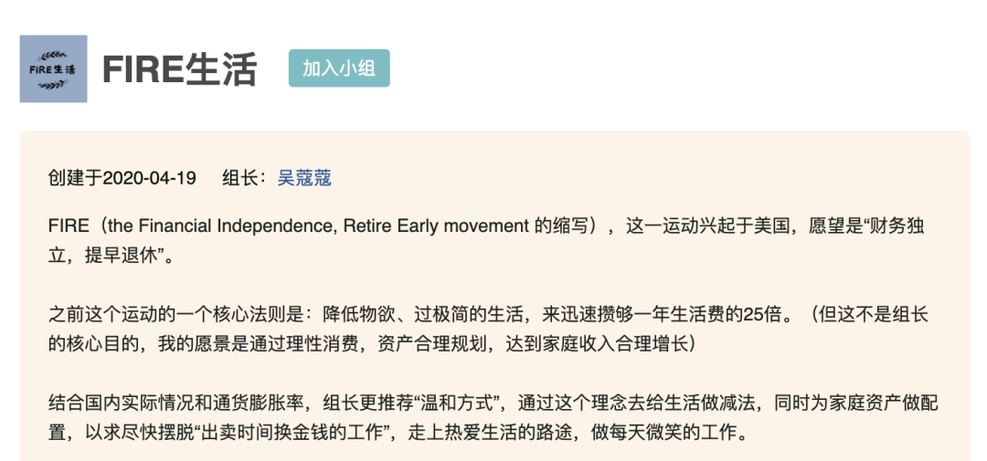 豆瓣有一个叫做“FIRE生活”的小组,这个小组里的成员们更像是在对自己的消费观和生活方式进行重新规划和反思。