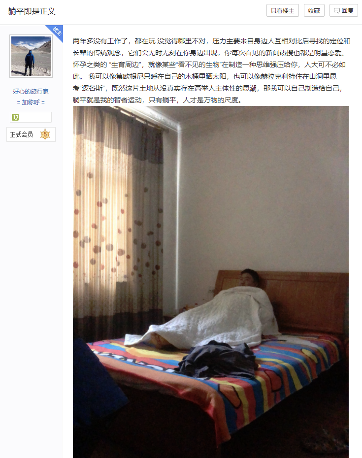 这个词来自百度贴吧中一个已被删除的帖子,题为《躺平即是正义》。 作者“好心的旅行家”在帖子里向网友们分享了他的躺平哲学。
