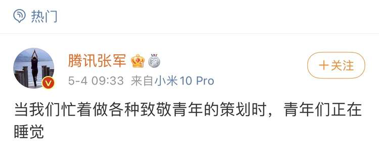 同样引发群嘲的还有腾讯公关总监张军在青年节发布的一条指责青年睡懒觉的微博。