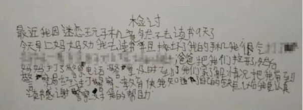 最后,男孩父亲过来接走小男孩,并对梅城派出所表示感谢。男孩回家后写检讨书给父母,内容写着:“感谢丁警官,我以后要认真读书。”